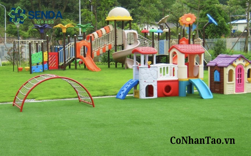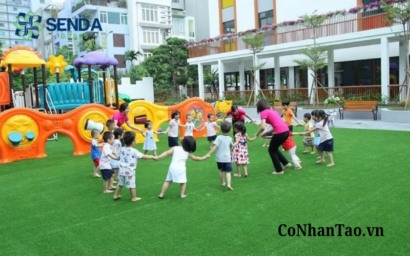 Các khu vui chơi, trường mầm non, sân chơi cộng đồng hay khu vực vận động cho trẻ nhỏ thường ưu tiên sử dụng cỏ nhân tạo sân chơi trẻ em vì tính an toàn và độ êm khi di chuyển.