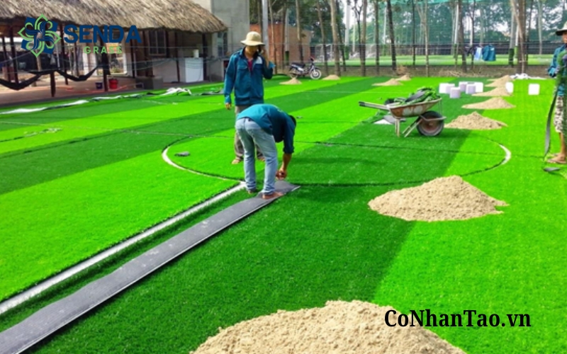 Sau khi chuẩn bị xong mặt bằng, đội ngũ kỹ thuật sẽ tiến hành cắt ghép cỏ theo đúng kích thước, dán nối các tấm cỏ, cố định mép cỏ và hoàn thiện bề mặt. Với một số công trình đặc thù như sân bóng hoặc sân chơi trẻ em, có thể bổ sung thêm lớp cát, hạt cao su hoặc lớp đệm giảm chấn để tăng độ êm và an toàn.