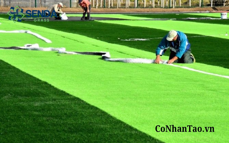 Tiếp theo là bước trải cỏ, căn chỉnh hướng sợi cỏ đồng đều để đảm bảo màu sắc và độ thẩm mỹ. Các mối nối giữa các tấm cỏ sẽ được ghép cẩn thận bằng keo chuyên dụng hoặc băng dán nối, đảm bảo kín, chắc và hạn chế lộ đường ghép.