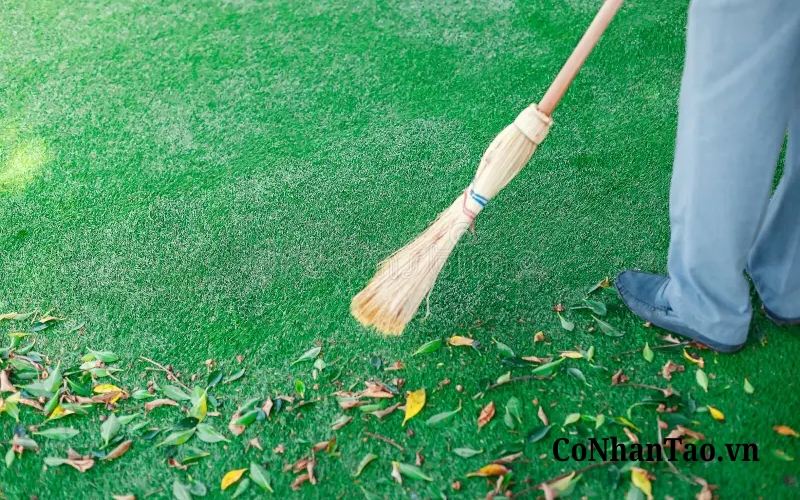 Vệ sinh cỏ nhân tạo nên bắt đầu bằng việc loại bỏ rác và bụi bẩn khô. Có thể sử dụng chổi mềm, máy thổi lá hoặc máy hút bụi công suất vừa phải. Đối với sân thể thao, nên chải dựng sợi cỏ bằng bàn chải chuyên dụng để khôi phục độ đàn hồi và giữ bề mặt luôn đồng đều.